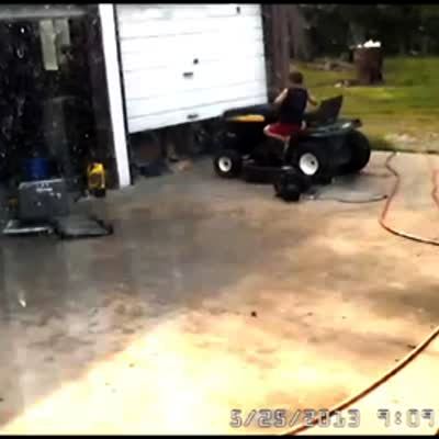 A woman rides a lawn mower out of a garage and into the yard and the rope for the garage door gets stuck on the lawn mower. The woman continues to drive and rips part of the door off the garage.