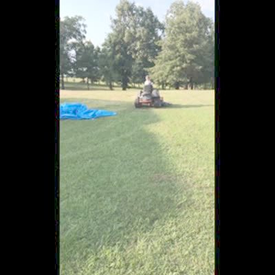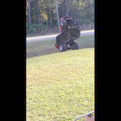 A man rides a tractor lawn mower outdoors when it tips backwards in a ditch, flips over, and drives away without him.