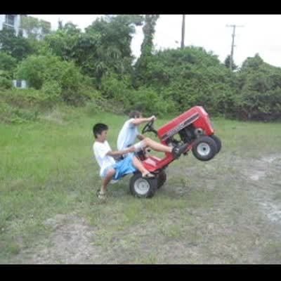 Two teen boys ride a lawn mower and try to do a wheelie. Boy's leg gets stuck on the tractor and he gets dragged across the grass.