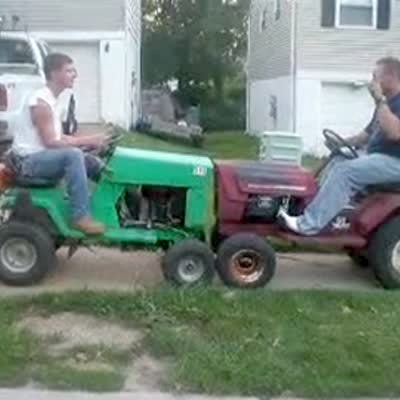 Two men sit on garden tractors/lawn mowers on a front yard sidewalk with the tractor fronts head to head. The two tractors push into each other, and push up onto their hind wheels. Both men fall off. One man's tractor smokes as the camera woman says "You blew it up."