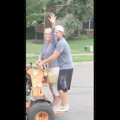 A senior woman and a young man ride on a lawn mower and then crash into a car.