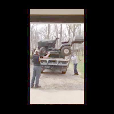 Two men raise a tractor lawn mower into the back of a truck using a lift but raise it too high when they try to pull it on and it flips and crashes down.