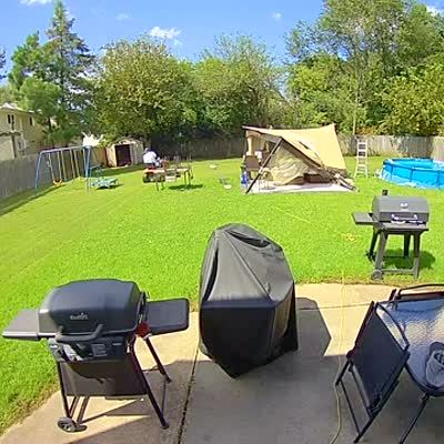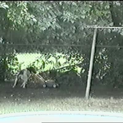 A man runs over a water pipe with a lawn mower and water sprays up in a backyard. He runs away. Security Footage.