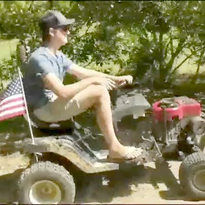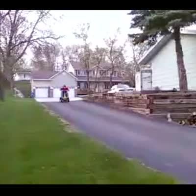 Man riding a go cart (lawnmower) with big wheels in rear, falls off cart, then the big wheels come off the cart. mower lawn grass cut