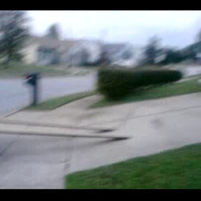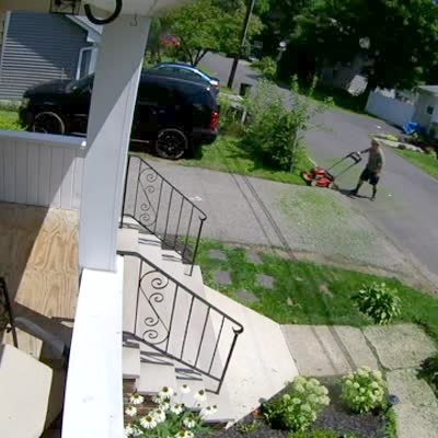 A woman drives a lawnmower up his driveway but she forgets to park it. She falls off and the lawnmower reverses into some trash cans. Security Footage.