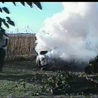 Man riding small lawn mower flips backwards, falls off. Smoke come from engines, bursts into flames. Fire. Man restarts tractor smoke pours out everywhere. Long for edit.