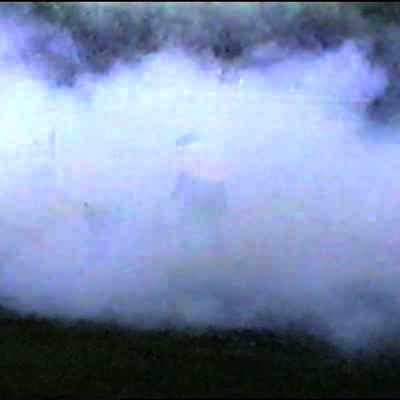 Man mows his lawn. His lawn mower is blowing huge amounts of smoke. His neighbors complain but he keeps mowing. The smoke is so thick you can't see him.