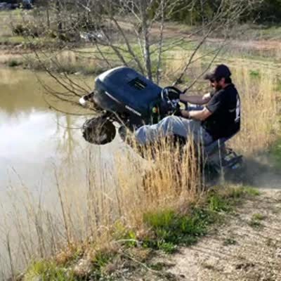 A man drives a lawnmower tractor up a hill and then loses control when he gets to the top and drives it into a pond.