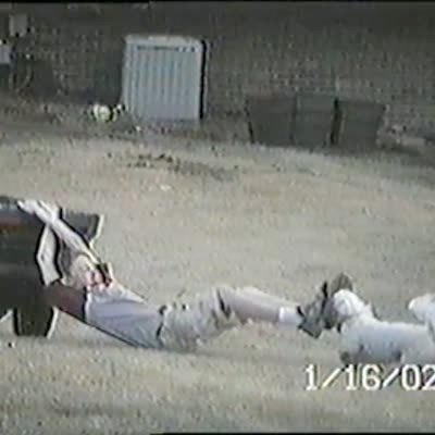 Man rides a tractor lawn mower in the backyard with a girl on his lap. They hit a tree when man is not paying attention & looking at the camera. Girl cries. Bonehead.