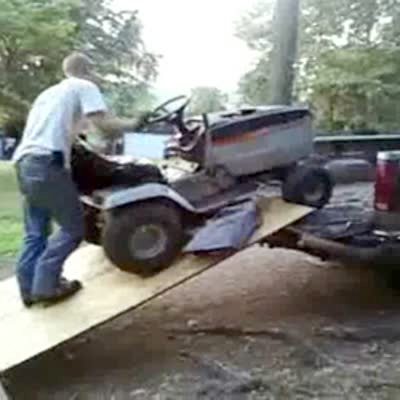 Man tries to drive riding lawnmower up ramp into bed of truck, ramp collapses and man crashes into back of truck and flips over.