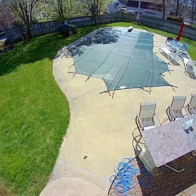 A man drives a lawnmower tractor in the yard. He drives onto a covered pool and falls through into the water. Home security camera