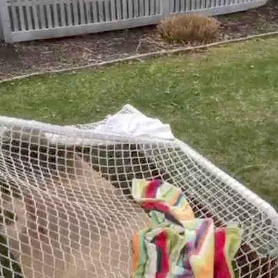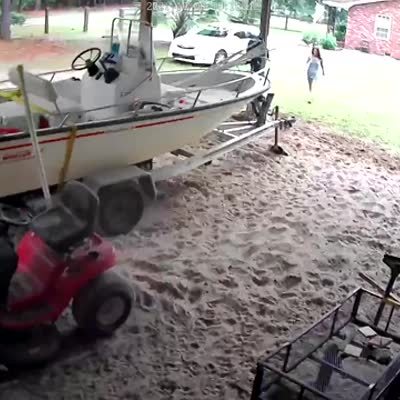 A man drives a lawnmower through his backyard but accidentally drives it into a lake. Security Footage.