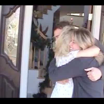 Man surprised wife by leading her outside on Christmas. Woman screams as son daughter-in-law show up as her presents. She's in her nightgown.