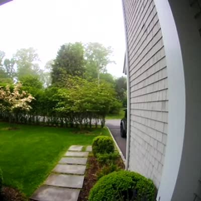 A man steps on a baby deer on his front porch, then runs away and screams when it cries. Then an adult deer comes back for it and leads it away. Security footage.