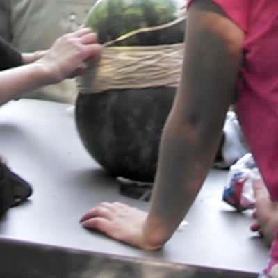 A watermelon leaks before exploding all over several kids and parents at 1:08 after they put rubber bands around it.