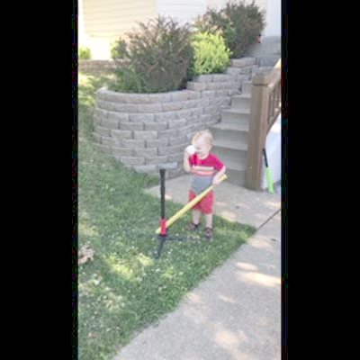 A young boy in a yard pours a cup of vinegar into a model volcano for a school science experiment he has to do at home and it erupts and splashes him in the face and a woman laughs.
