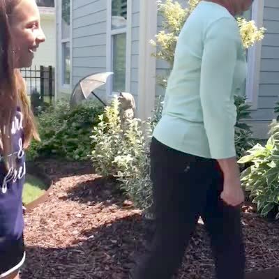 A young girl holds a bucket under a dog in the yard. The woman with the camera asks what she is doing and the girl says "milk a cow." The dog walks away and the girl follows it with the bucket. The dog lays down and the girl reaches to grab its penis.