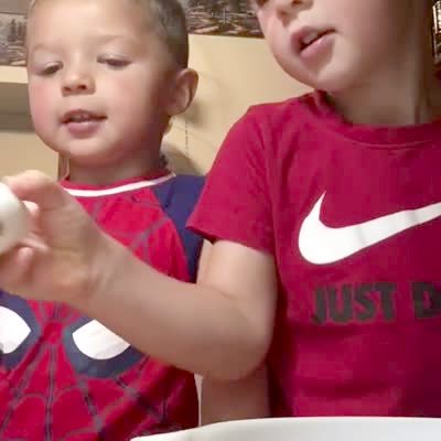 A woman tries to make pancakes with two tot boys in the kitchen, and when she turns away the younger boy pours nearly the entire bottle of oil into the mixing bowl.