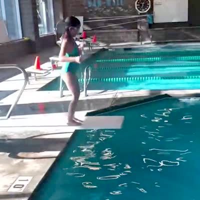 A young girl does a flip on a diving board at an indoor swimming pool, then she falls back onto it and lands in the water.