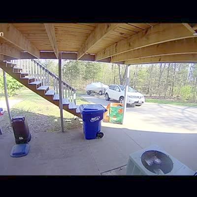 A teen girl backs a car into the driveway, and then hits the boat behind the car which crashes into the woods. She then drives the car forward, and away from the boat. Home security footage.