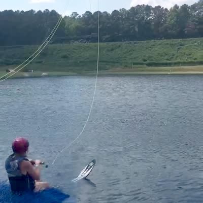 A woman flies out of her water skis on a lake when a boat pulls her away.