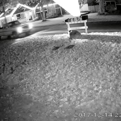 A teen boy drives a truck and knocks multiple mailboxes off a post in a yard at night. Home security camera video, no audio.