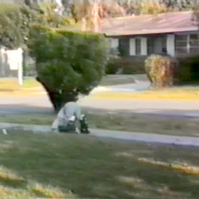A young man lists off some safety tips before he zip lines in a yard, then the rope breaks, and he falls down.