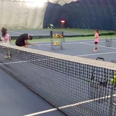 A man gives a tot girl a tennis lesson and she hits him in the groin.