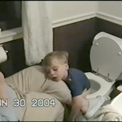 Tot boy sleeping on a woman's leg while sitting on the toilet