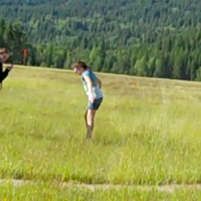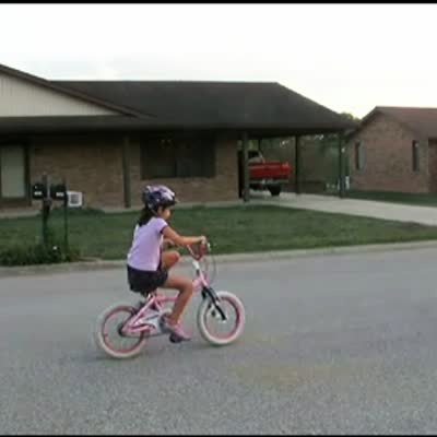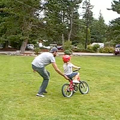 Dad pushes daughter on bike in a field, girl starts to fall off. Dad tries to catch her & ends up straddling her.