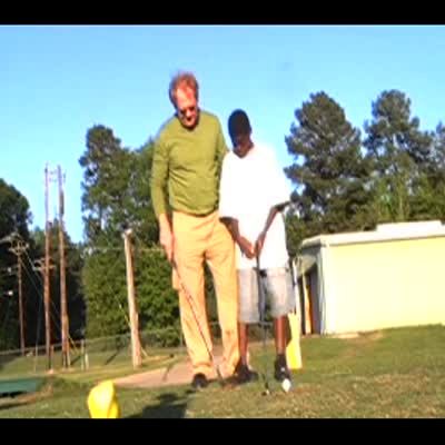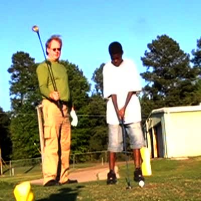 teen boy has a golf lesson. Practices swinging his club slowly and hits instructor / teacher in the head.