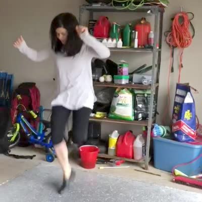 A woman step dances in the garage, and falls onto her face.