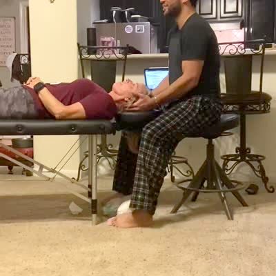 A woman does the uncooked pasta prank when a man does a chiropractor adjustment on her in the living room.