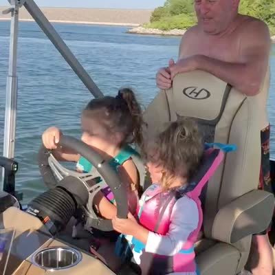 A man teaches a tot girl how to drive a motor boat on a lake, then she speeds it up, and the person behind the camera falls down. First person POV.