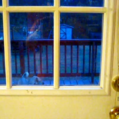 A small terrier dog is jumps up and down to look into a window at home when she wants to be let inside.