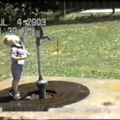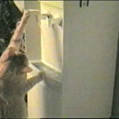 A teen girl in a kitchen holds a cup to a refrigerator water dispenser and asks another teen girl if she wants some water. She presses the lever, water shoots out, and the camera pans down to show the second girl lying on the floor and the water falling into her mouth while she laughs.