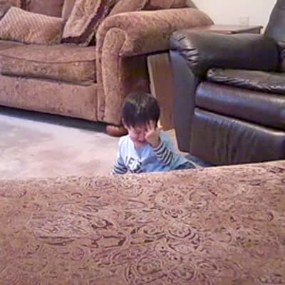 Tot boy pulls lever on recliner as dad is crawling toward him, dad gets hit in face by foot of recliner.