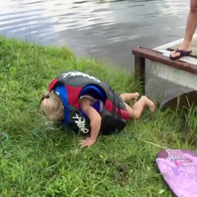 A young girl wears several life vests and is too scared to jump into water off a dock, so she jumps into the grass, falls over, and struggles to stand back up. She then jumps in the water, struggles to swim, and climbs back out but falls again.