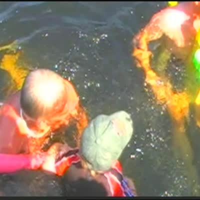 Senior man tries to put baby boy in the water from a boat but he accidentally falls in himself. Baby has life vest on. Lake.