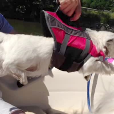 A man holds up a small white dog by her life vest on a speeding boat and the dog paddles her paws as though running through the air.
