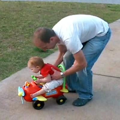 Tot boy launches air rocket by jumping up and sitting on the launch pad with his butt, the rocket flies into the air. Mom claps for him.