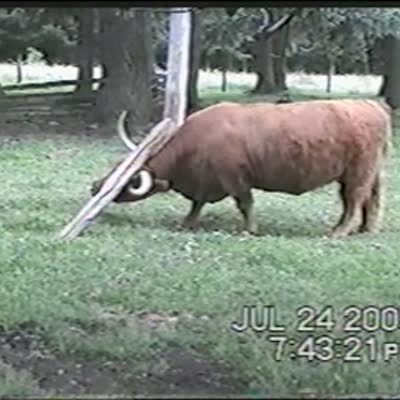 Cow / bull plays with wood fence post. Lifts it off ground and balances it on horns. Silly pet trick. Farm.