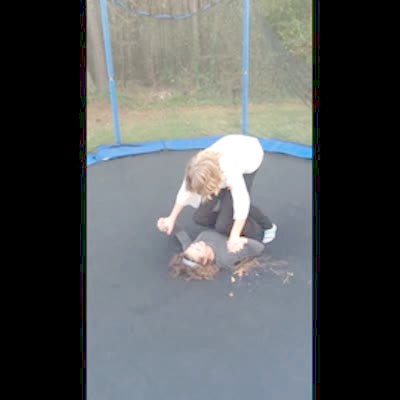 A young girl tries to lift another young girl on a trampoline but accidentally pushes her. The young girl falls off the trampoline.