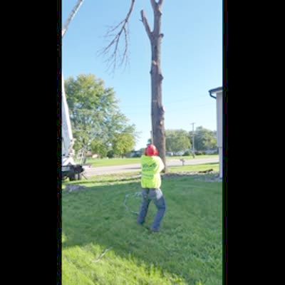 "Lumberjack Liftoff" A man uses a pulley to cut down a tree branch and when the branch falls, the man is launched into the air.