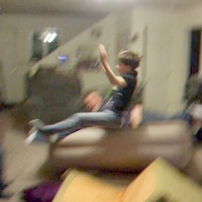 2 bonehead men bounce a boy off an inflatable mattress in the living room, boy hits his head on the ceiling light.