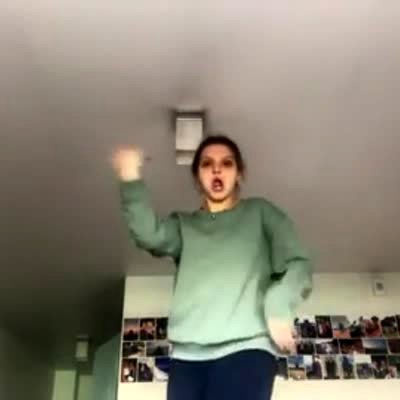 A young girl dances in a bedroom and looks shocked as she throws a water bottle over her head and it crashes and breaks a light fixture. Music rights not cleared.