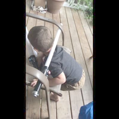 A tot boy gets his head stuck in a chair with a light saber toy through it.