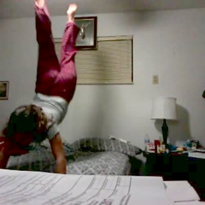 A young girl knocks a piece of a ceiling fan onto her head when she attempts a handstand on her parents' bed.