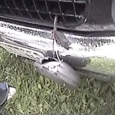 A man jumps off of a stair railing onto a car outdoors. He knocks out the car's head light, amusing the man behind the camera. They talk about how mad their friend is going to be about the car. Action ends around 1:00.