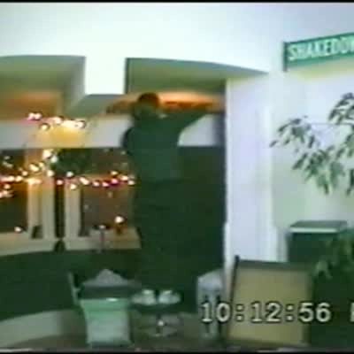A man that carries a young girl on his shoulder and she hits head on porch light above. Security footage.